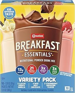 About this item Nestle Carnation Breakfast Essentials individual packets have 13 grams of protein and 220 calories, providing energy and building muscle. These essential minerals and vitamins supply the body’s nutritional needs. The Carnation Breakfast Essentials helps maintain strong and healthy bones. The high amount of vitamin D improves calcium absorption The powder mixes with milk for on-the-go convenience. › See more product details